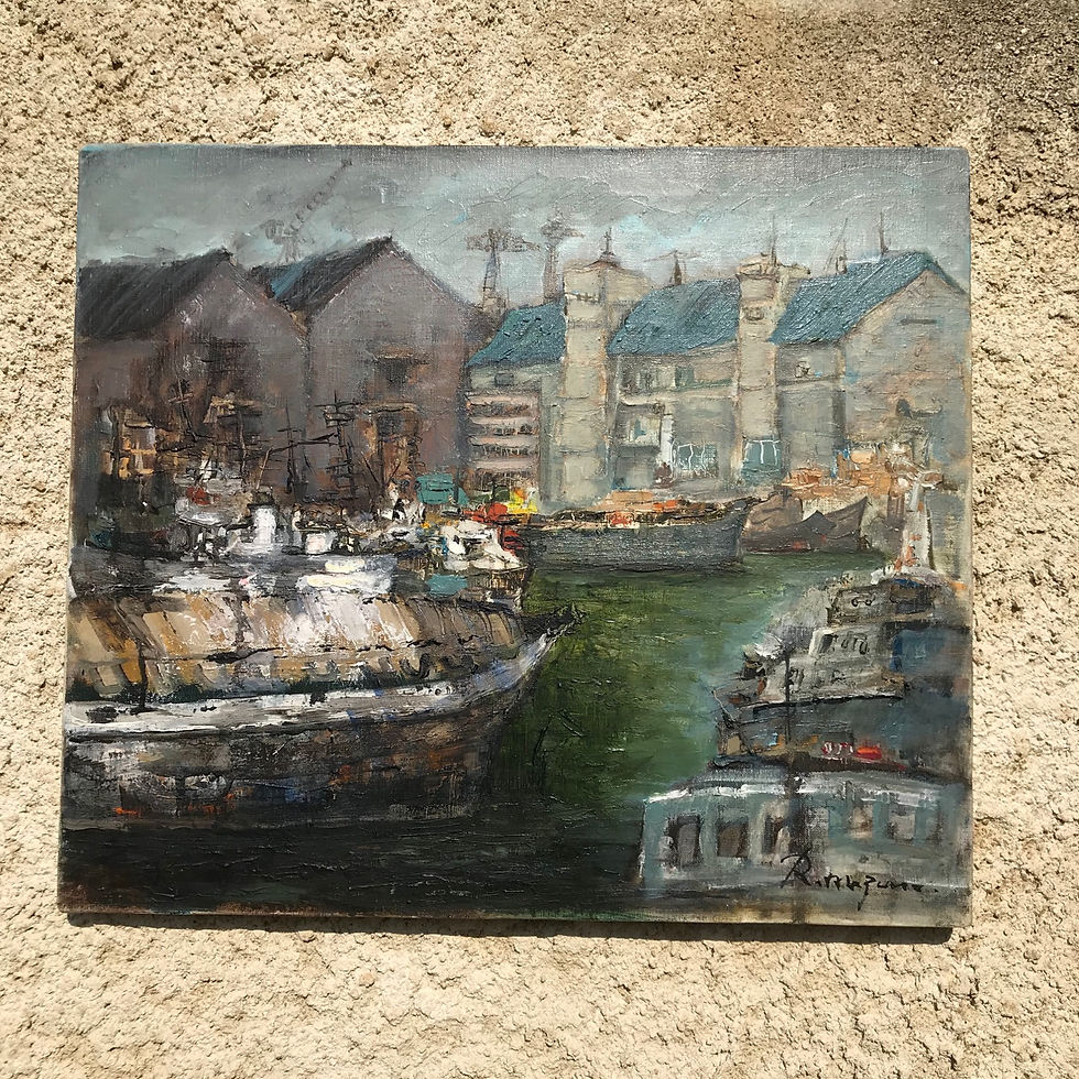 Oil on canvas original work - Harbour landscape by R Mizuno